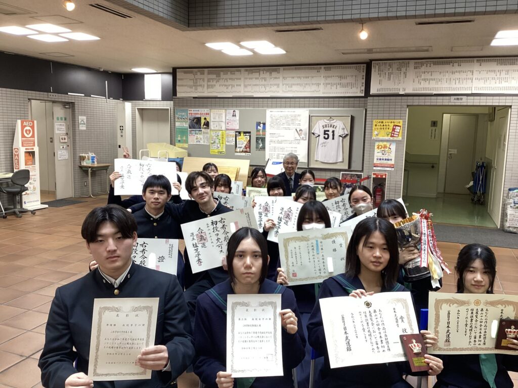 修了式に先立ちまして、表彰伝達が行われました。漢字検定、英語検定、数学検定は、スライドにて紹介。バドミントン部、書道部、美術部、女子バレーボール部、合気道部、父母の会表彰は、校長先生より表彰をいただきました。みんな、おめでとう!
