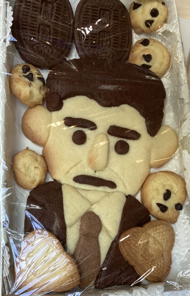 家庭科研究部では、今年度をもってご退職される専任教諭の戸井田先生・車田先生への贈り物としてお菓子【似顔絵クッキー】を作りました。