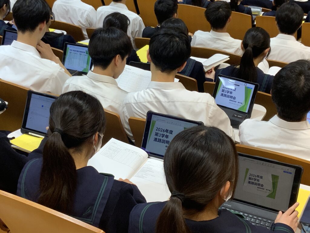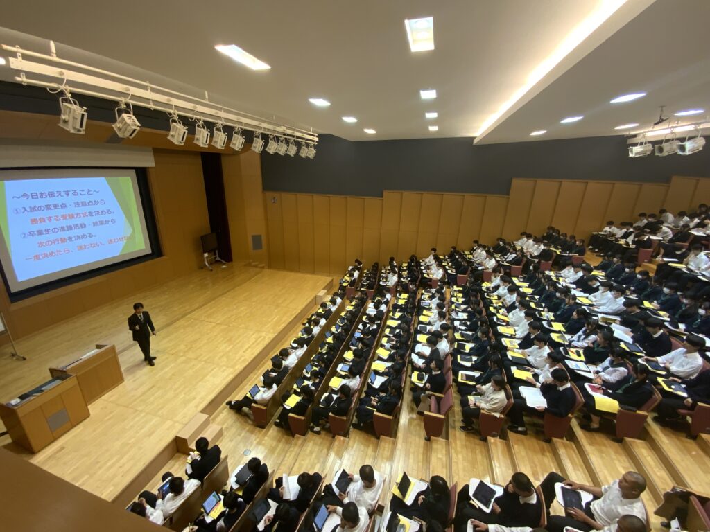4月16日(木)には、三年生向けの進路ガイダンスを実施。進路指導部主任の神戸先生から今この時期に必要な進路情報や熱いメッセージ、そして学年主任の永井先生からも三年生に向けた力強いメッセージがありました。