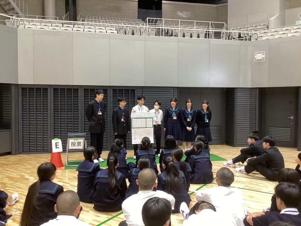 作成した計画書をもとに、学校説明会形式でクラスごとの発表を行いました。生徒たちは、自分が実際に通いたいと思う学校の説明に投票し、各クラスの代表を選出しました。さらに、各クラスで選ばれた代表が全体の前で発表を行いました。