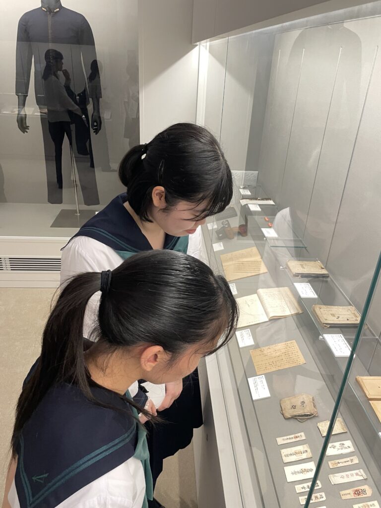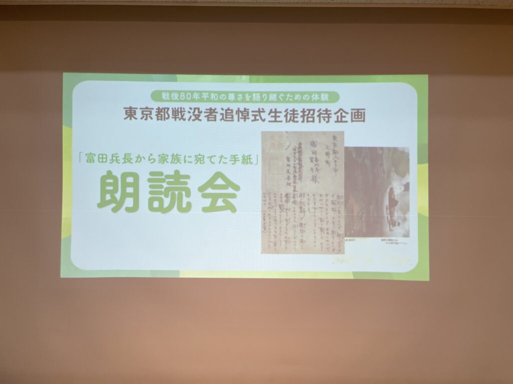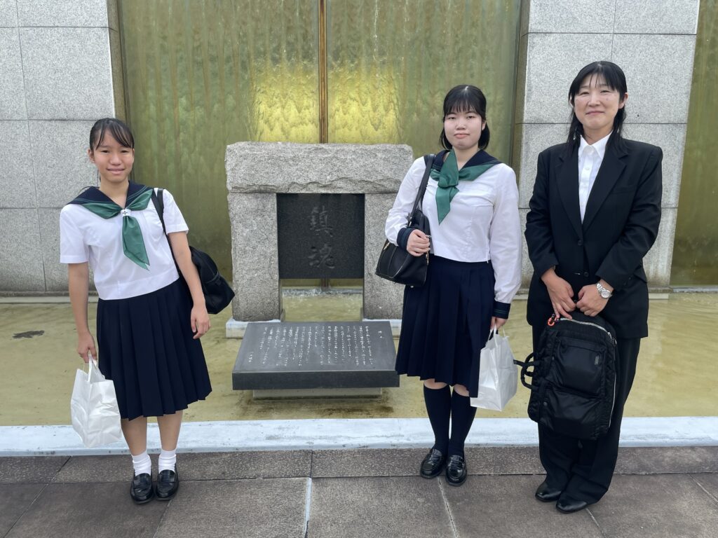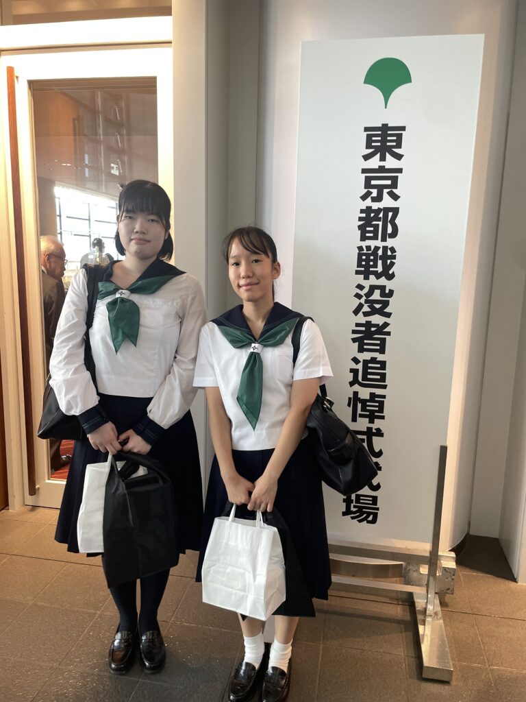 この企画は式典への参列以外にも、戦場から家族に宛てられた手紙の朗読会体験や、東京都戦没者墓苑内の遺品展示室の見学ツアーなど平和について考える大変意義深いものでした。本校からも2年生の佐藤さん、3年生の馬場さんの2名が参加しました。この2名の想いを紹介します。
