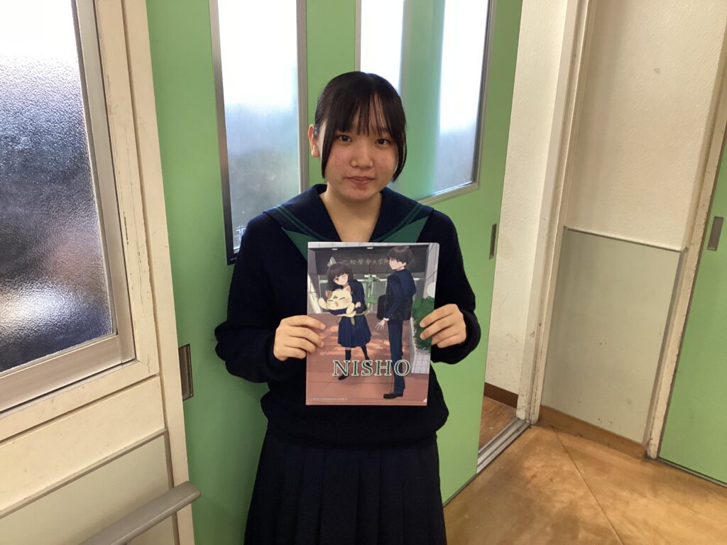 今年は最優秀賞を2つ選び、それらをクリアファイルとして作成しました。すでに在校生、ならびに学校説明会の参加者には配布をしております。1人目は、3年生の佐野さんです。
