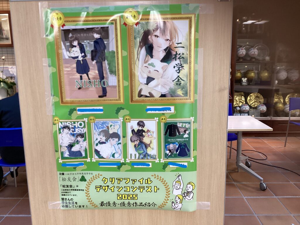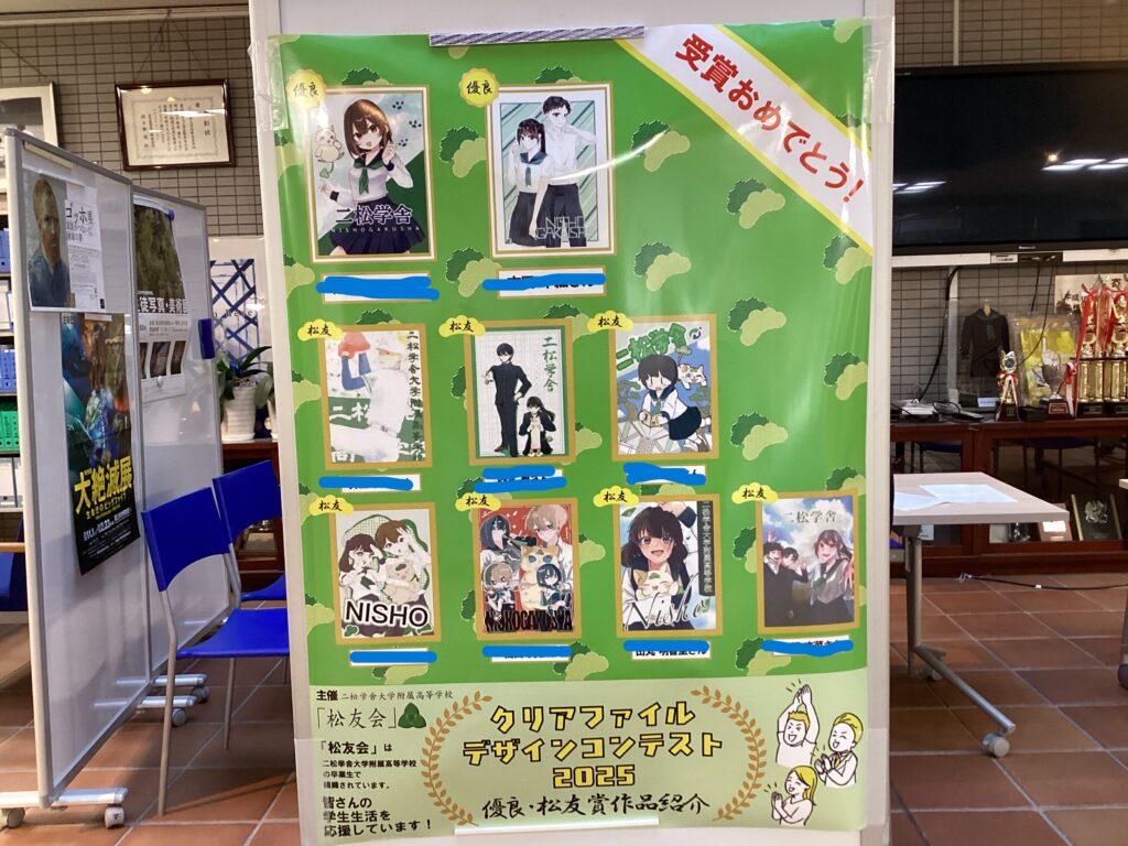 早いもので、もう師走。1年を振り返る機会が多くなることと思います。さて今日は、毎年恒例のクリアファイルコンテストの結果をお届けします。これは、9月の二松学舎祭の時期、本校の同窓会「松友会」(しょうゆうかい)が主催しています。毎年応募者のレベルが上がり、良い意味で、選考に苦慮しています。以下のポスター写真は、入賞者の一覧です。