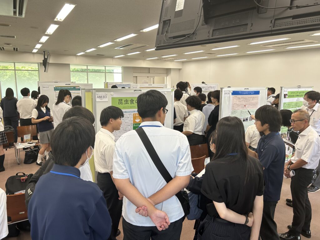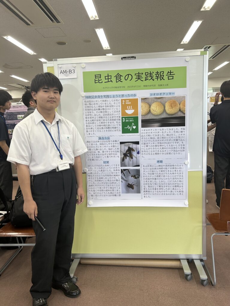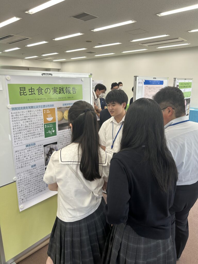 本校からは、2年生の後藤くんが「昆虫食の実践報告」を発表しました。ポスターセッションは好評で、他校の生徒たちや先生方と質疑応答を活発に行なっていました。