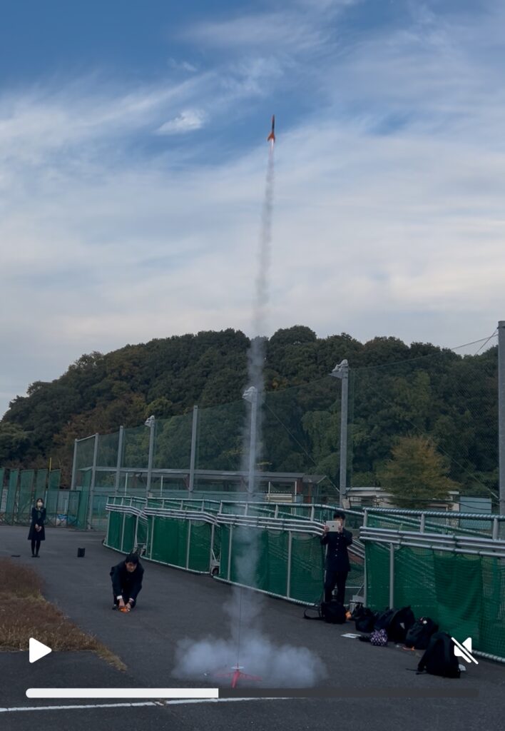 これまでに校内で燃焼実験を行ったり、飛翔角度や飛翔距離の測定方法などについて検討を重ね、今回、実際にロケットの発射に挑むことができました。