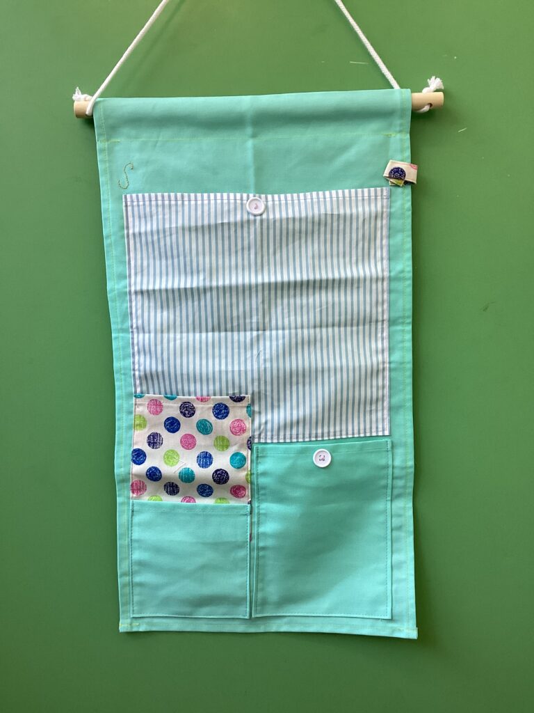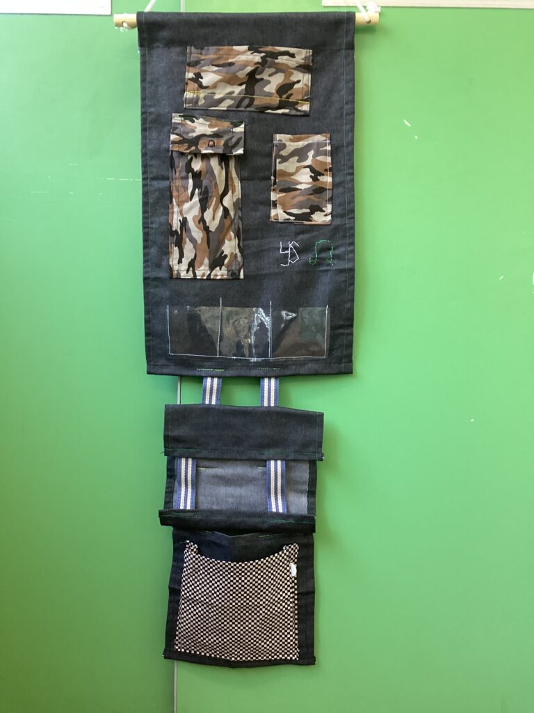 2年生の家庭基礎の時間、ファミリーポケットを製作しました。「誰のため」「どこで使うか」を意識して作ることがポイントです。いくつか優秀作品をご紹介します!