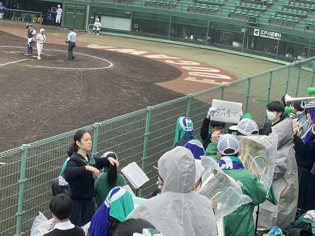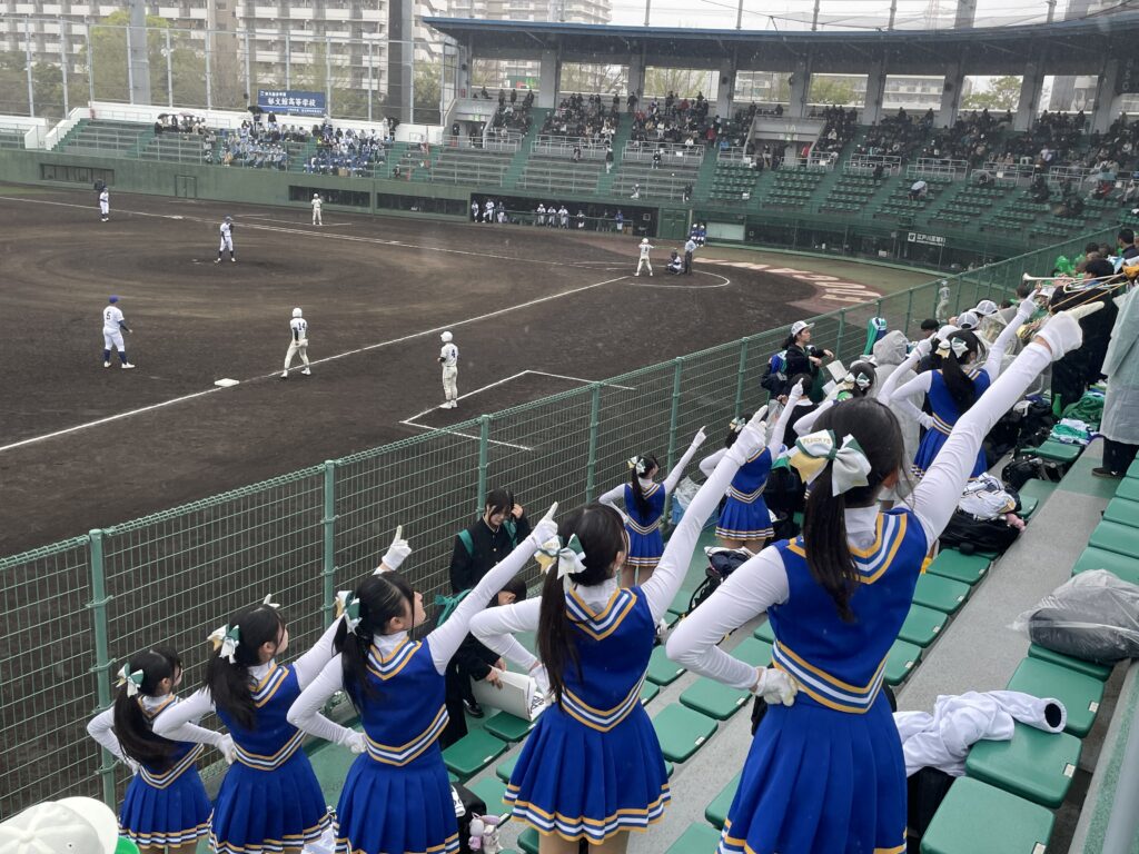 不安定な天候の中、吹奏楽部、チアリーダー部、応援団の3部がスタンドでの応援を盛り上げてくれました。