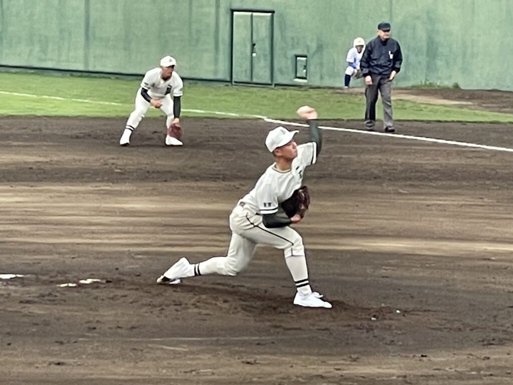その後も、初回だけで3投手を継投した相手投手陣を打ち込み、打者一巡の猛攻で、8安打7得点と大きく試合を動かします。一方、本校の先発投手は、2年生左腕・川島蓮十君。川島君は、2年生ながら、昨夏の東東京大会から投手陣の中心的な存在として活躍し、経験も十分です。初回から大量の援護をもらった川島君は、相手打線につけ入る隙を与えず、3回まで相手打線をパーフェクトに抑えます。4回、5回に四球でランナーを許しますが、ノーヒットピッチングを続け、6回2死から許したヒット1本に相手打線を抑え、6回83球で1安打完封勝利を上げました。攻撃は、3回に1点を加え、6回には、先頭の小田切のヒットから再び打線が繋がり淺沼君のセンターへのタイムリー2塁打、7番・佐南健生君(3年)のライトへのタイムリー2塁打、これに相手のミスも重なり、12ー0とリードを広げます。この後、雨が強くなり1時間以上にわたり試合が中断しますが、集中力を切らす事なく、6回裏の相手打線の攻撃を0で抑え、12ー0、6回コールドでの勝利となりました。